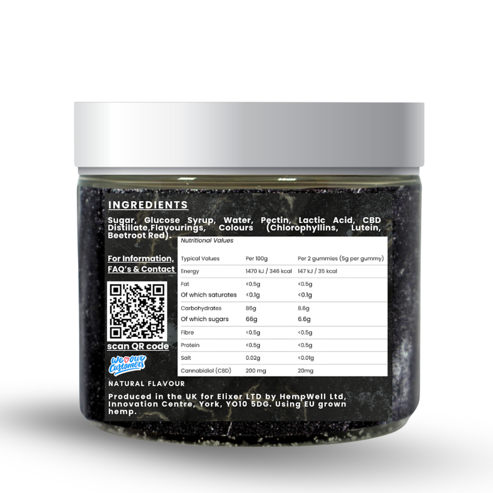 | Typical Values | Per 100g | Per 2 gummies (5g per gummy) |
